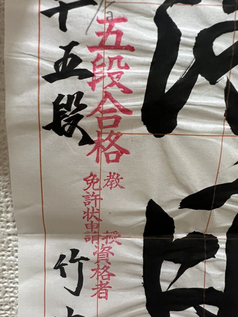 級位は一般的に10級~1級までで、基本的な筆の使い方、正しい文字の形、バランスよく、という事らしいです。段位は1級の次が初段。段が上がるにつれて表現力や筆使いの自由度が求められます。3段~4段になると中級者から上級者として認められ展示会で入選も期待されます。「師範」は指導者の資格を持つ証。「教授」は団体内でも特に高い技術、指導力の証。「無鑑査」は一般を超越したレベルの書家に与えられるそうです。